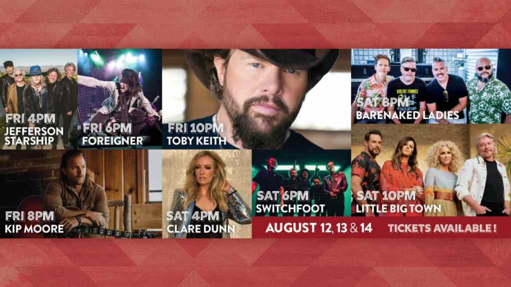 This year’s Main Stage performances will again showcase a span of genres including country, classic rock and alternative pop/rock with a lineup comprised of some of today’s biggest names including Toby Keith, Little Big Town, Kip Moore, Barenaked Ladies, Foreigner, Switchfoot, Jefferson Starship, and Clare Dunn.