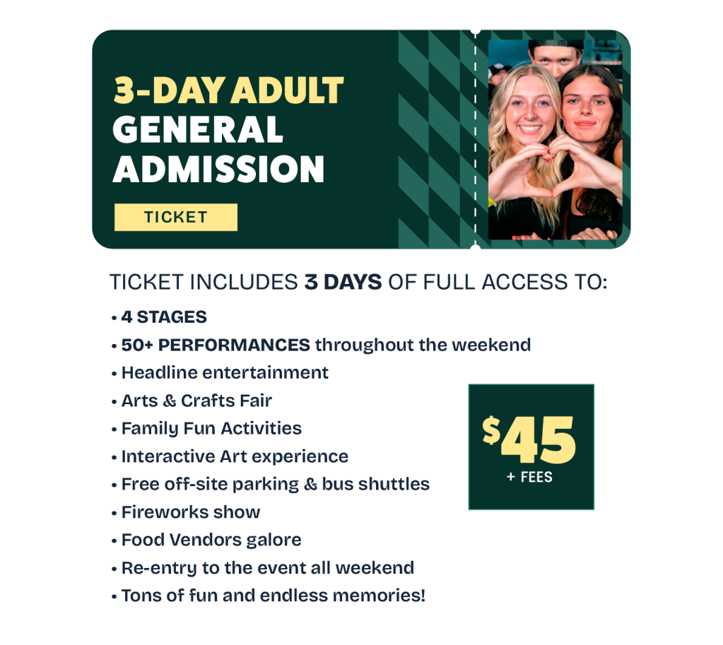 By purchasing admission, you are agreeing to be filmed, photographed and/or otherwise recorded on event grounds. Captured imagery will be used at the festival’s discretion.